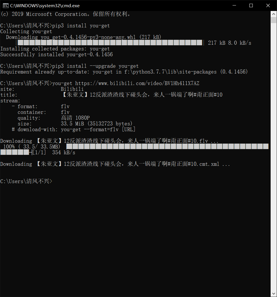第三步,输入pip install you-get,等待下载完成。然后升级。等这些都弄好之后,输入you-get 视频网址;然后等待下载即可,市面上的视频基本上都可以下载。