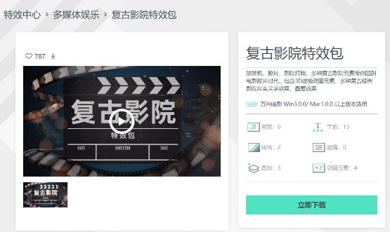 首先进入日韩精品久久久久喵影资源商城下载“复古影院特效包”,特效包中包含了十三种字幕,两种转场效果,三种叠加效果,四种动画元素,可供我们使用。