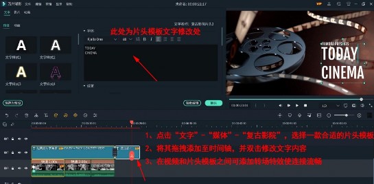 将用来制作片头的图片或视频导入到素材库和时间轴上,小编用到的是卓别林、秀兰·邓波儿、奥黛丽·赫本三位的电影片段,制作一种怀旧感的片头,同时使用了二倍速加速,让视频片段看上去更有趣。在串联几个视频片段时可以用到复古影院特效包中的字幕条来丰富画