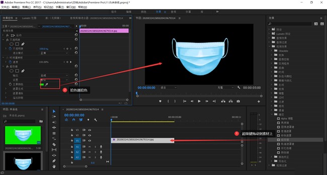 导入视频素材,切换到效果面板。在右边菜单栏“效果”中找到视频效果,点击下拉菜单中的“键控”,从而找到“超级键”。将超级键拖到时间轴的视频素材上,单机拾色器,在绿色背景上拾色,可以发现口罩图像成功抠出。