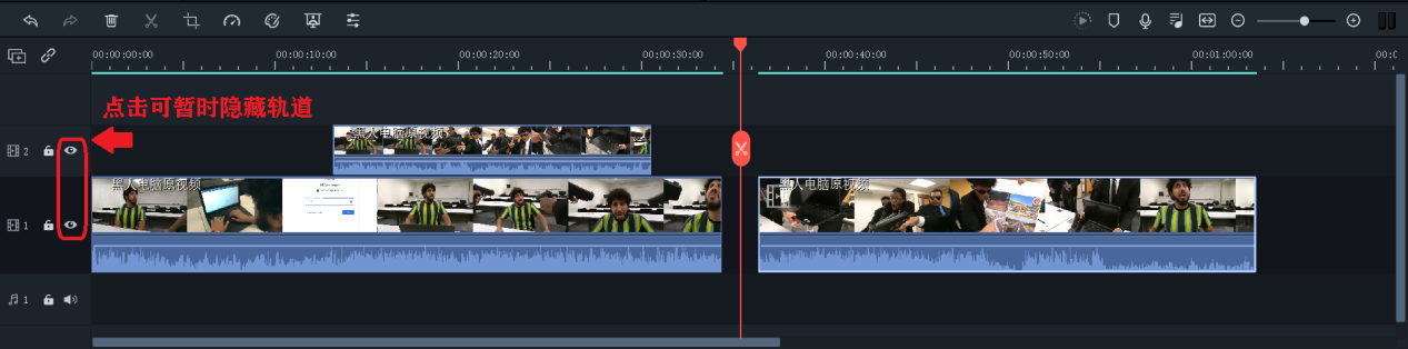 如果犹豫不决,可以吧片段拖动到其他轨道上,并点击“眼睛”暂时隐藏掉,减少后续编辑各个片段时的影响。在时间轴上把相应的片段调整好对应的位置后,最后导出时,片段即参考时间轨道会自动合并了