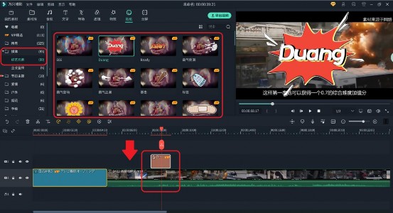 点击“贴纸”-媒体-综艺元素,找到前面推荐的特效包贴图素材,选择合适的素材,拖到其他轨道即可