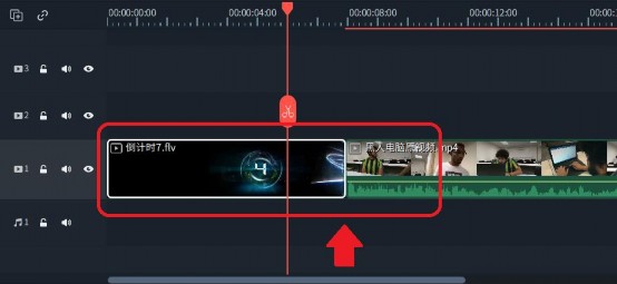 把原视频片段往右拉一点,如图,把倒计时片头素材拖动到轨道起始处,并做好与视频的衔接