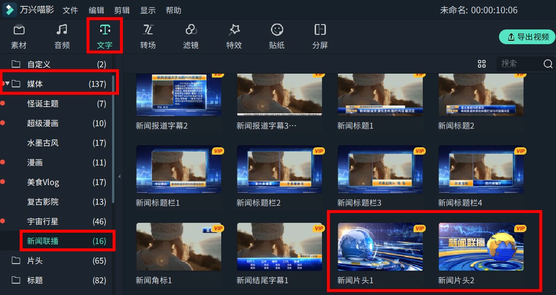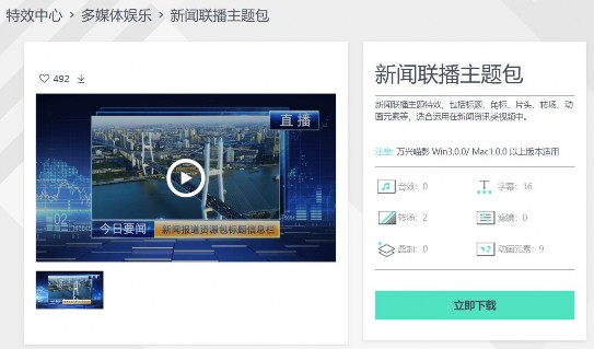 我们要用到的是日韩精品久久久久喵影软件内所自带的资源商城里的新闻联播主题包,打开资源商城后输入关键字即可查找到并下载。新闻联播主题特效有十六种字幕,两个转场特效,九个动画元素,包括了标题、角标、片头、转场、动画贴纸等内容。