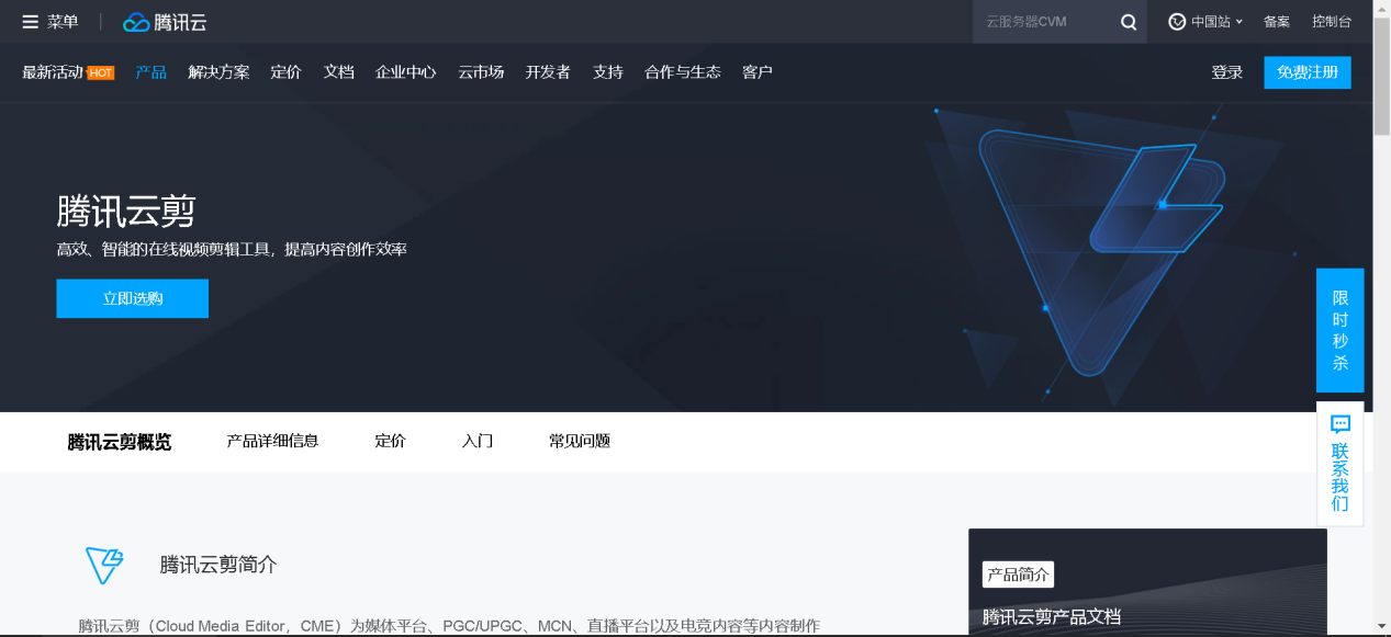 这款主攻在线剪辑功能,是腾讯公司旗下的视频编辑工具,不同于上面两款。腾讯云剪较为专业,适合企业公司使用。它也包含一些基础功能:剪切、拼接、滤镜、动效、转场、语音转字幕,更可提供一键分发到企鹅号、微博等新媒体平台,帮助用户直接在云端完成视频采集、编辑、合成、发布全链路流程。