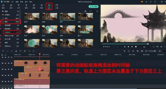 在图片(短视频)轨道上方的一条轨道上添加符合同一主题的动画贴纸。小编选用的是古亭、奇峰和断桥三种贴纸,将其按照出现的顺序依次放置于时间轴轨道上,并调整好其位置和大小。我们通过点击拖拽视频画面中的动画贴纸即可实现它们的移动,大家可以随心所欲安排它们在画面中的出现,同时,我们在点击了贴纸后,会出现一个选框,这个选框可以帮助我们调整其大小,甚至可以调整角度。