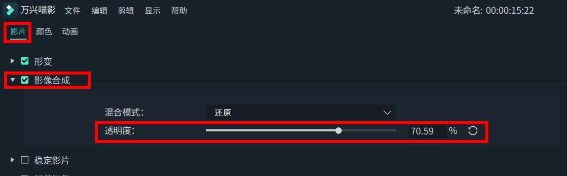 为了营造出空间感,即远处模糊近处清晰,同时带来与所选贴纸相符的一种远山朦胧的感觉,可以适当的对贴纸进行透明度的修改。双击需要进行修改的贴纸轨道啊,在“影片”中展开“影像合成”一项,调整“透明度”数值以修改其显现程度。