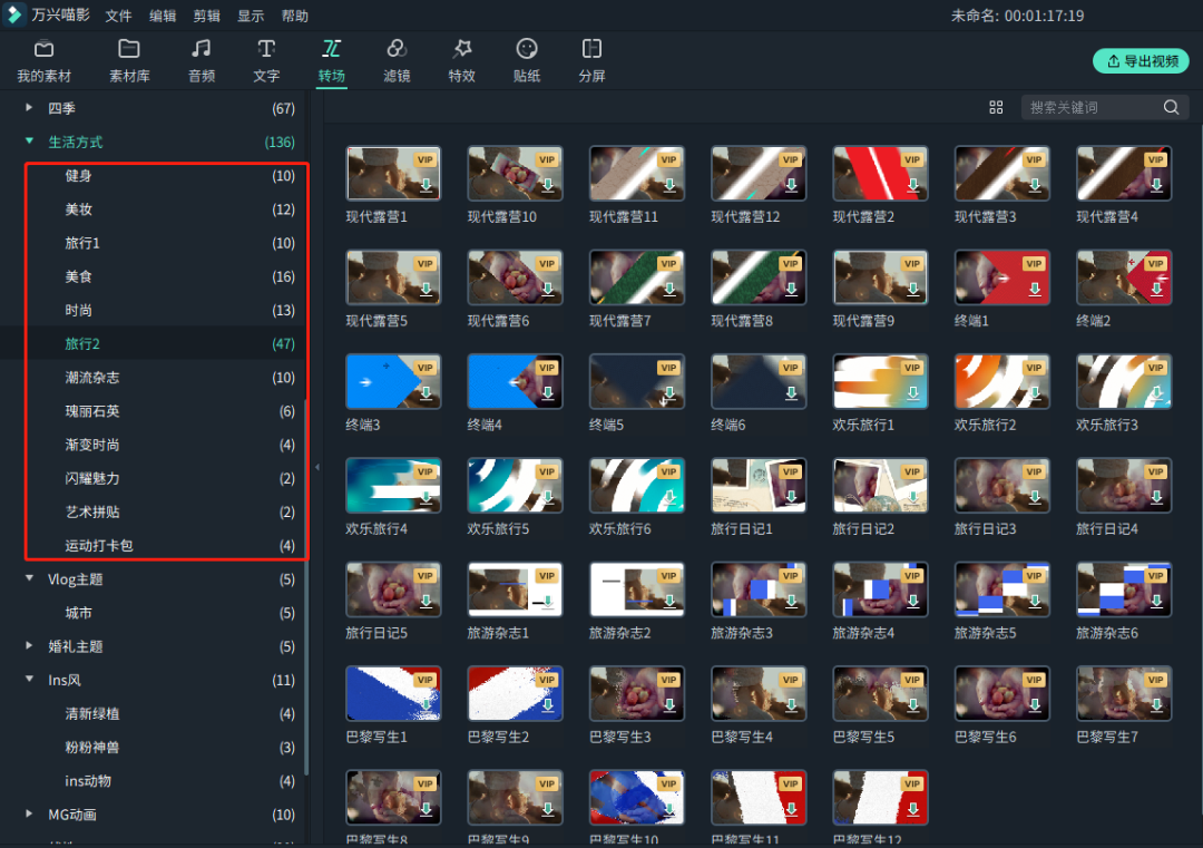 除了节日主题,还可以根据视频的风格来选择合适的转场,有水墨、武侠的古风系列,还有80年代、老式电影、蒸汽朋克、日式旅行、ins风等流行的风格。