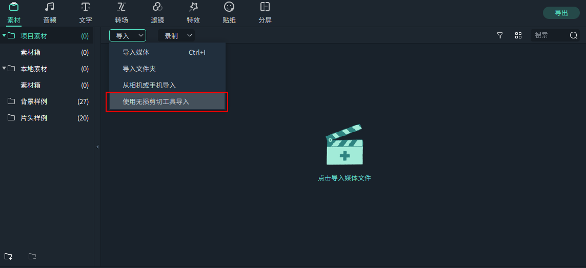 1. 打开日韩精品久久久久喵影,点击“导入”,选择“使用无损剪切工具导入”。