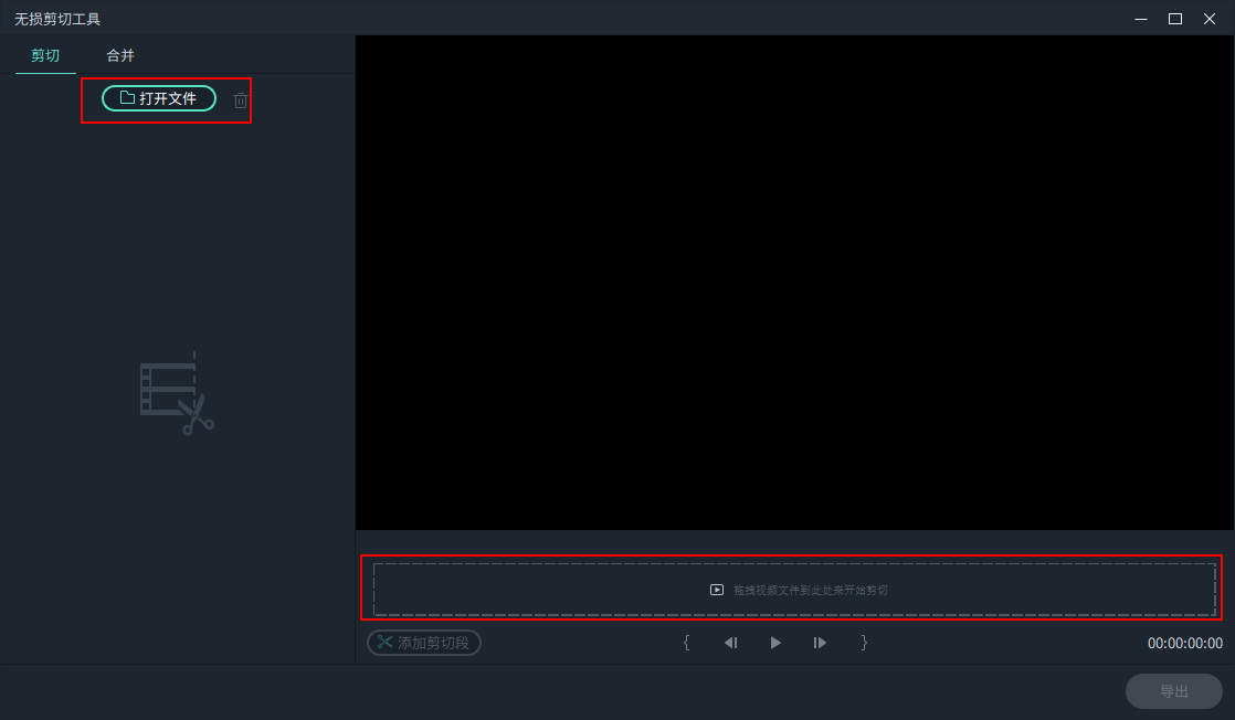 1. 编辑面板有“剪切”和“合并”两个模块,默认打开进入“剪切”模块。点击“加载文件”,从弹窗中选择要导入的视频文件,一次只可导入一个视频。或者直接将文件拖拽到红框处。