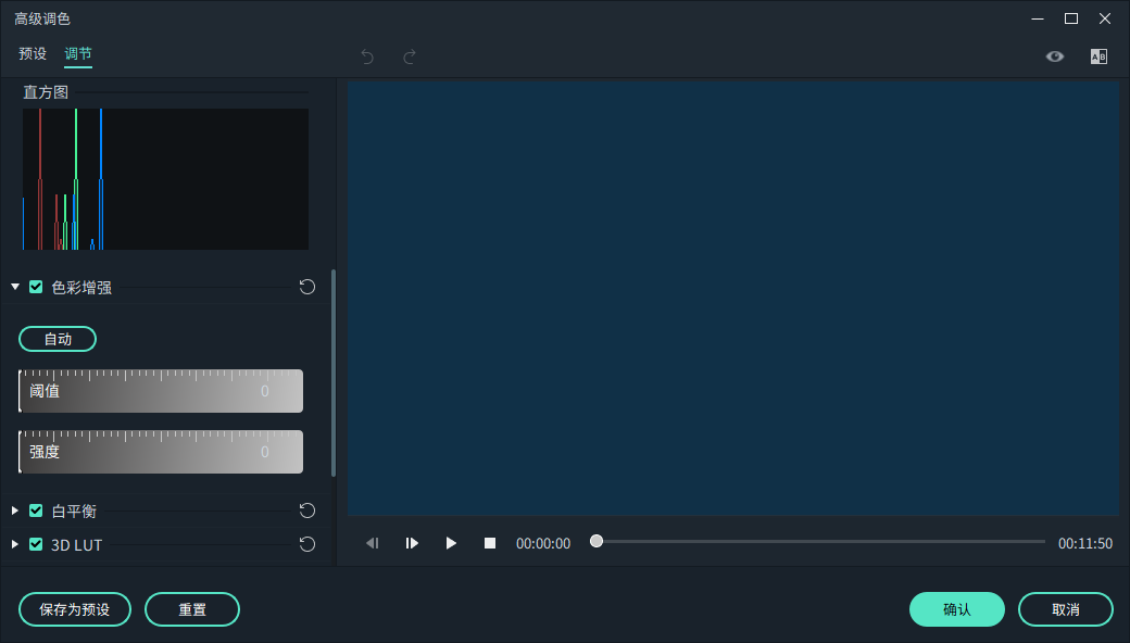 分别拖动滑块以调整色温,色调,对比度,饱和度和亮度。知道精确调整的参数,也可以输入数值。 如果想一次性调整整个视频,还可以使用3D LUT效果。可以通过预览窗口,来查看调整效果。