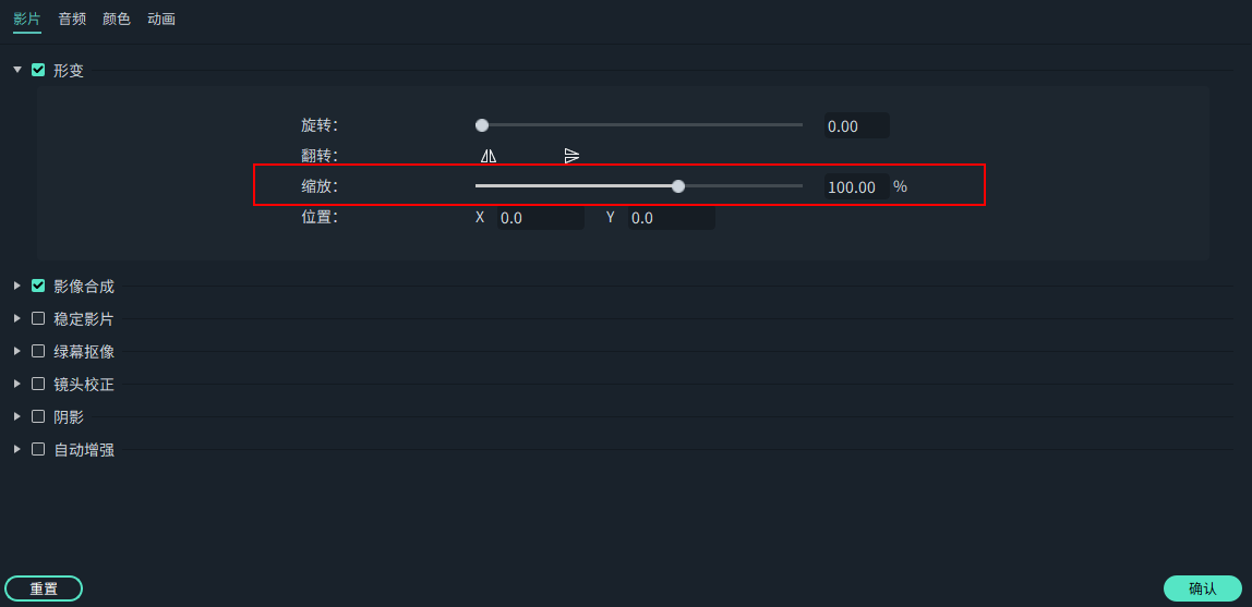 右键单击需要在时间轴中调整大小的视频片段,然后选择“显示属性”,并单击弹出窗口中的“视频”栏。切换至“形变”并向右或向左拖动“缩放”滑块以调整视频片段的大小。如果知道要缩放的确切百分比,也可以输入精确值。